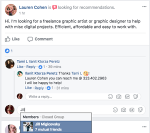 If someone’s asking for a recommendation on a specific group, I can only tag the person I want to recommend if they’re in that group. If I want to recommend someone who’s not in the group, then I can’t just tag them in the post. I’d have to type in their name and phone number by hand, and unless I’m recommending my BFF – ain’t nobody got time for that.